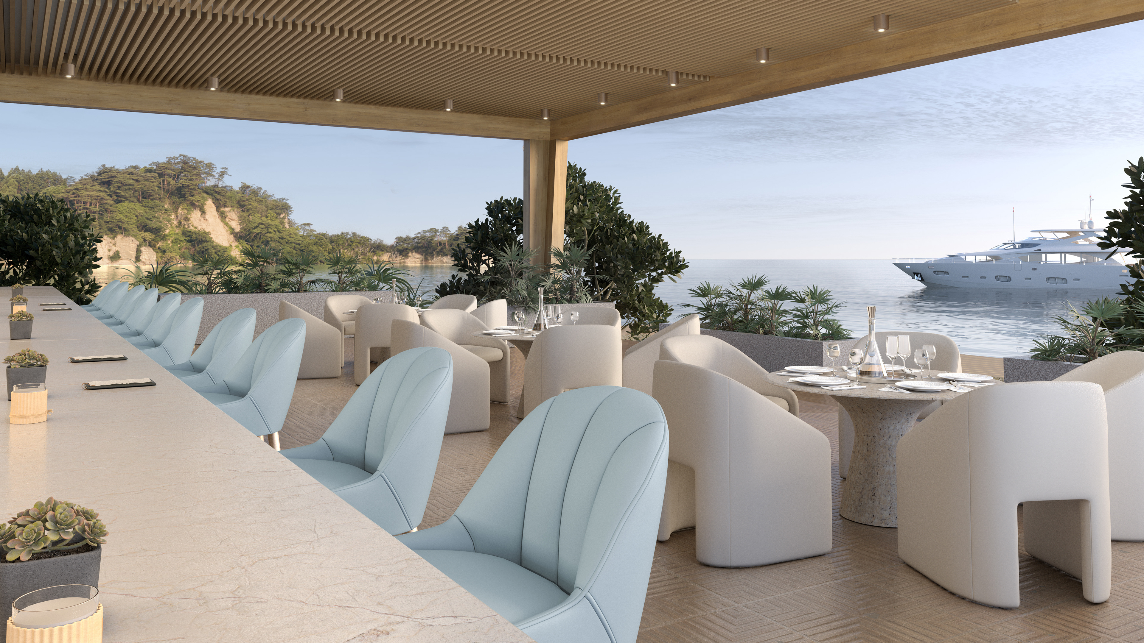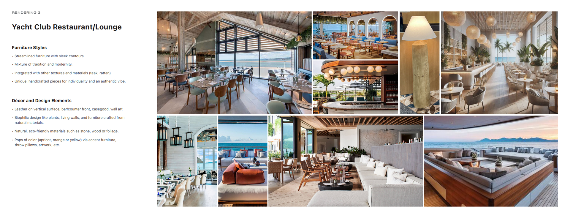 Client-provided reference slide outlining material selections, mood, and the Yacht Club’s setting. The design brief emphasized a luxurious yet relaxing atmosphere, one that feels communal and seamlessly connects the indoor and outdoor environments while celebrating the surrounding nature.