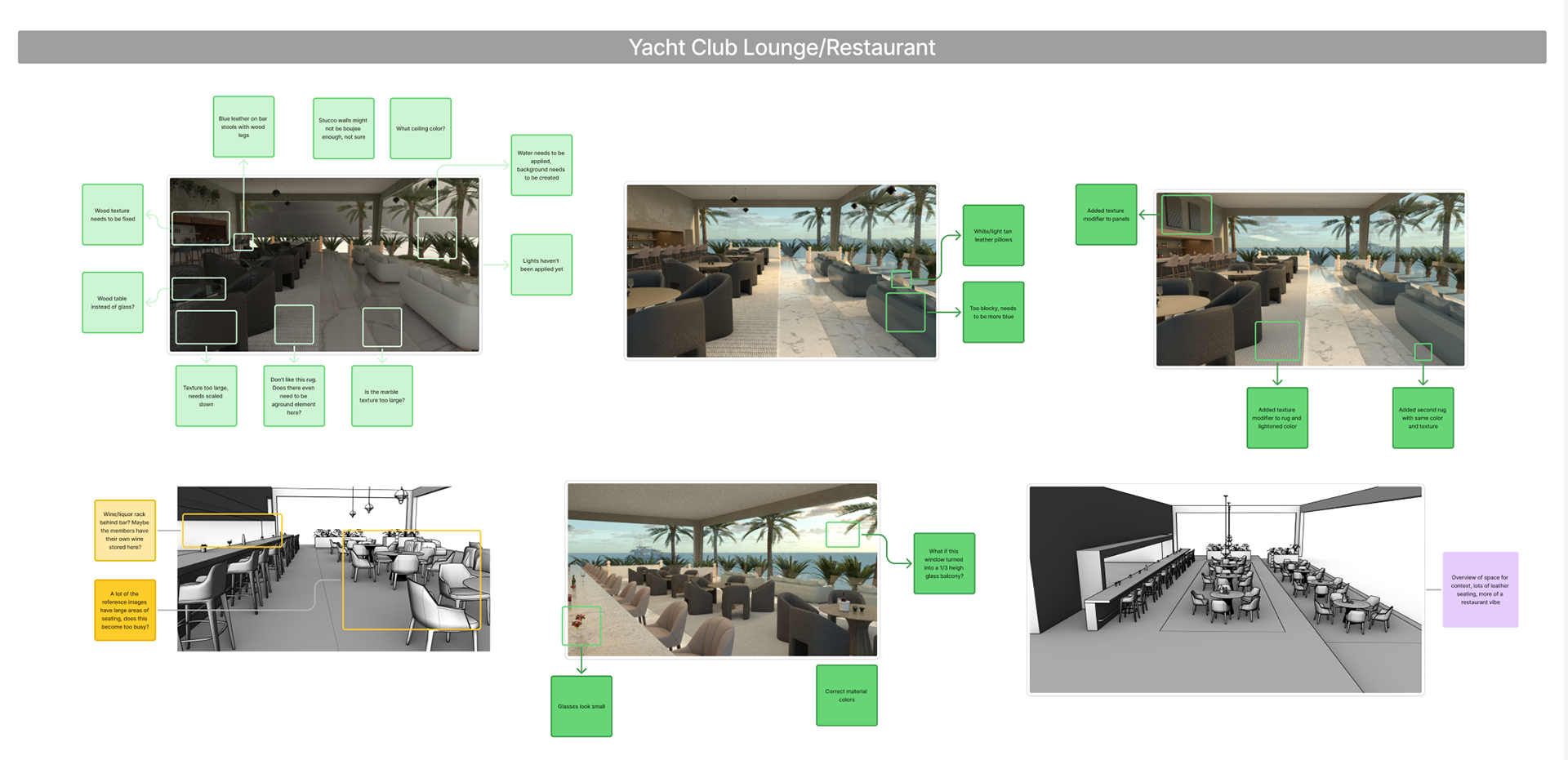 The space began to take on its distinct character, but clutter and competing elements kept the leather from being the focal point. Simplification was needed to let the leather shine while preserving the luxurious, exclusive atmosphere of the club. Subtle details like wine glasses and spirits suggested the space’s purpose for dining or drinks, while the yacht in the background was positioned off to the side, enhancing the sense of luxury without distracting from the scene. These refinements brought clarity and focus to the design, ensuring the leather remained the true hero of the space.