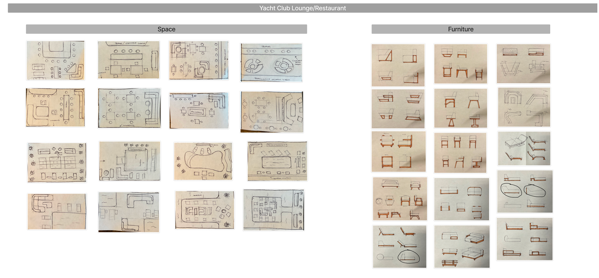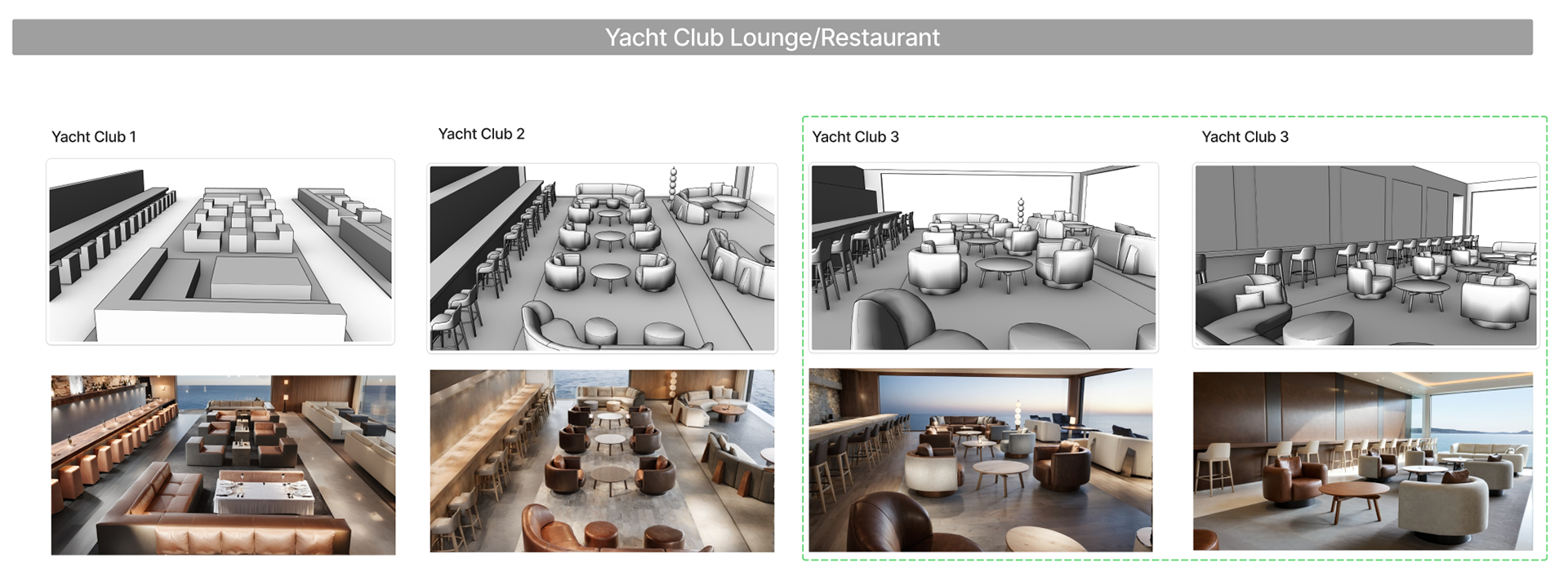 Four conceptual spaces were selected to showcase the leather collection within a luxurious, naturally inspired environment. The client reviewed these options and selected Yacht Club 3 to move forward, recognizing its balance of elegance, comfort, and material presence.