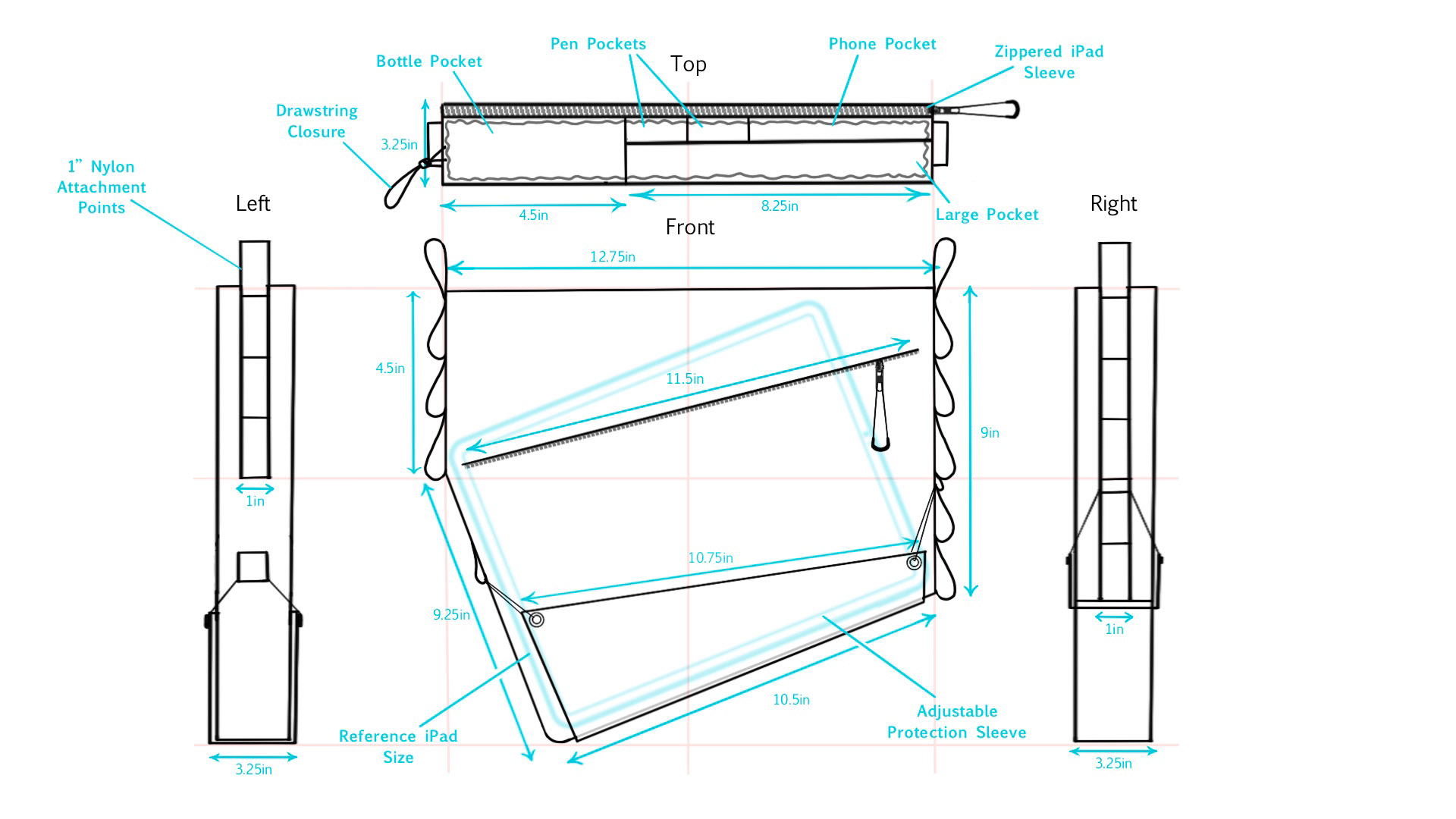 Technical drawings illustrate how the iPad fits within the bag. The top view highlights the organization of various compartments, including two zippered sections, an exterior pocket, and an iPad sleeve. A drawstring closure at the top allows for quick access and accommodates larger items, such as a water bottle, while maintaining a secure fit. An adjustable protective sleeve runs along the bottom of the bag, acting as a sacrificial layer when placing the bag on the ground and providing extra reinforcement for carrying heavier items. This sleeve also secures larger objects, like a jacket, freeing the user’s hands.
