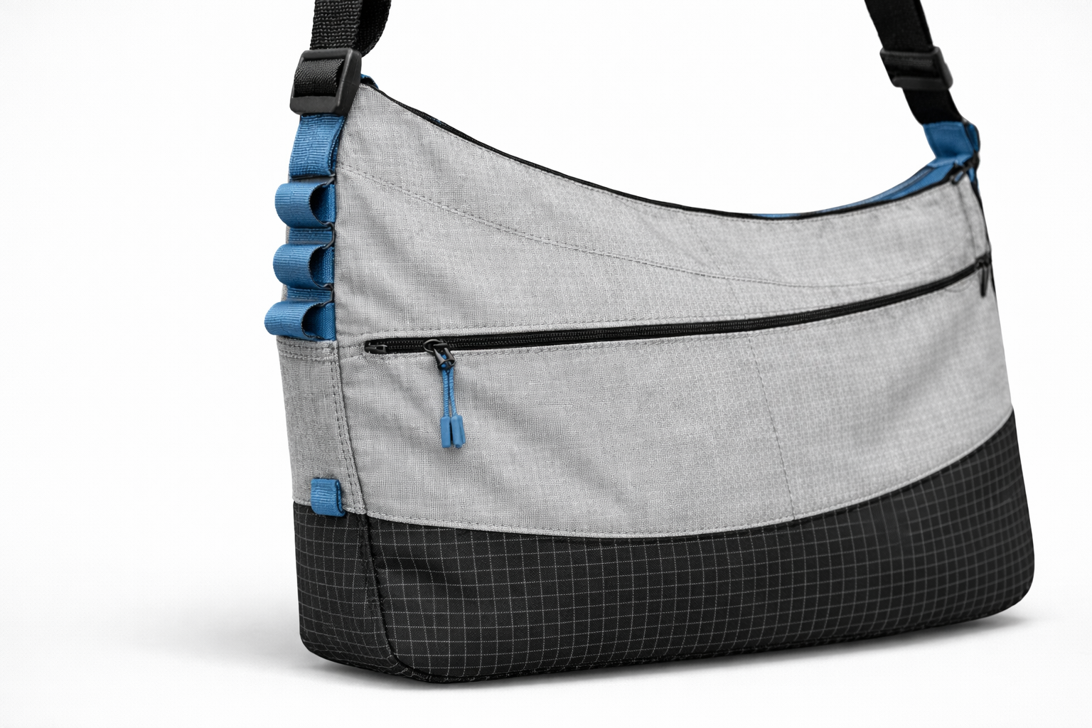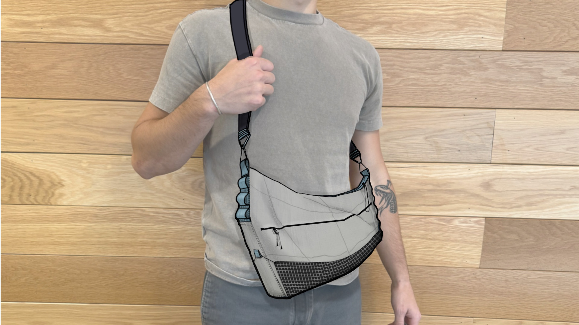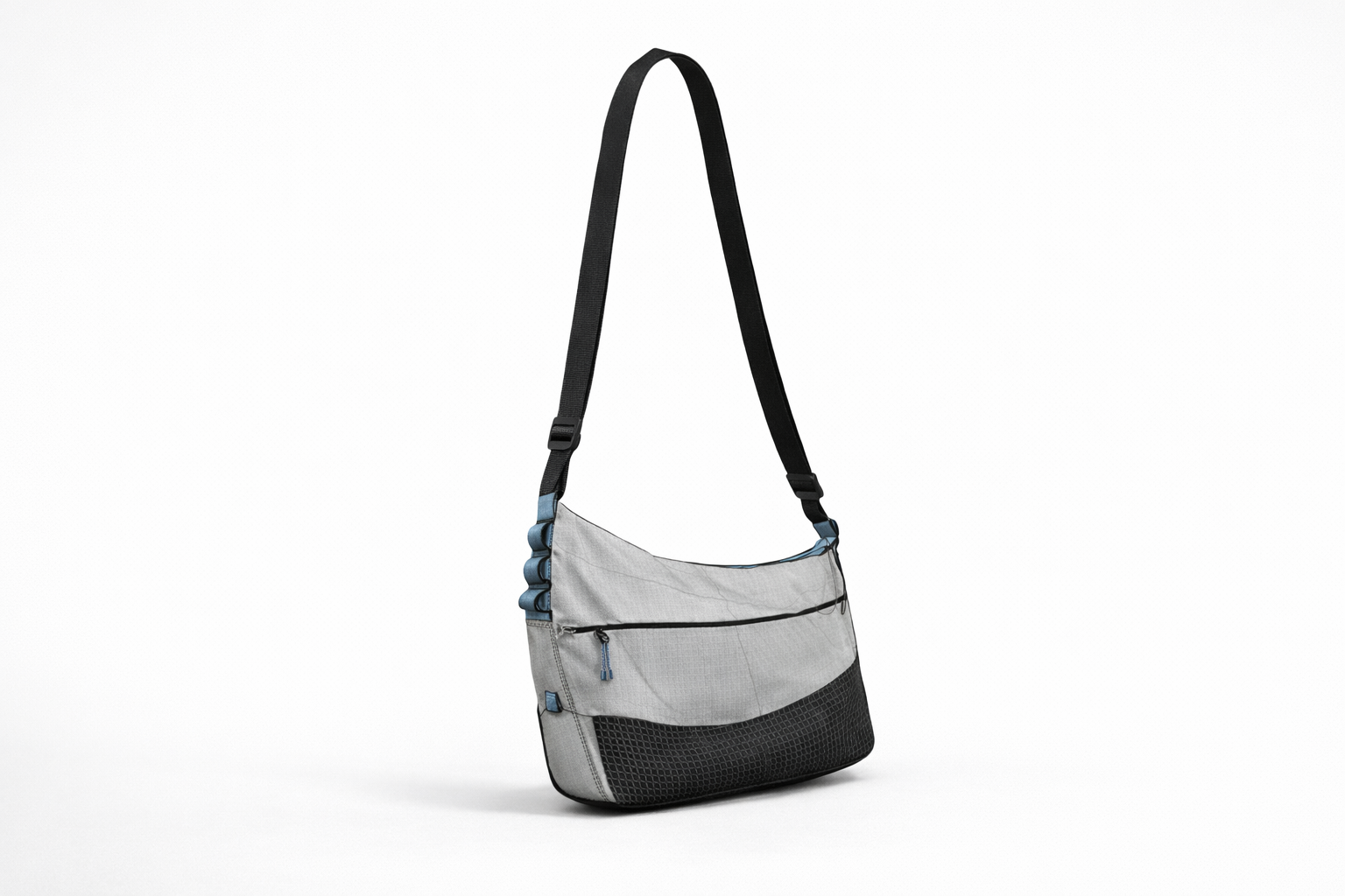 The bag’s size falls between a 2L crossbody and a full-sized messenger, making it ideal for carrying everyday essentials. Color and material breaks are strategically used throughout the design to highlight key interaction points and enhance usability. A secondary fabric panel is tethered to the bottom to provide added support when the bag is full and doubles as a convenient spot to secure a jacket. Multiple attachment points along the sides offer versatility for clipping keys, ID cards, or other quick-access items.